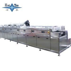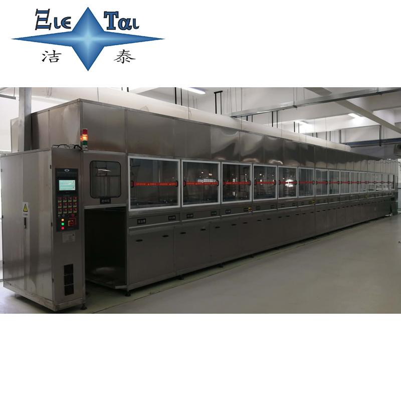 潔泰電池殼模用機械臂式全自動超聲波清洗機,主要由:機械傳動系統、超聲波系統、加熱系統、烘干系統、給排水系統和電氣控制系統等6部分組成,一般采用PLC進行控制,操作簡便,可通過修改程序方便地調整設置參數及工藝流程在線監視系統的工作狀態,可自動完成工件的粗洗、噴淋、噴流、熱浸、漂洗、鼓泡、烘干等工藝,大大節約人力,提高效率。